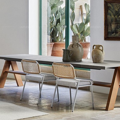 戸外柚木テーブル椅子庭園別荘花園実木は古い食卓ベランダのレジャー屋外藤編ソファーの組み合わせをしている