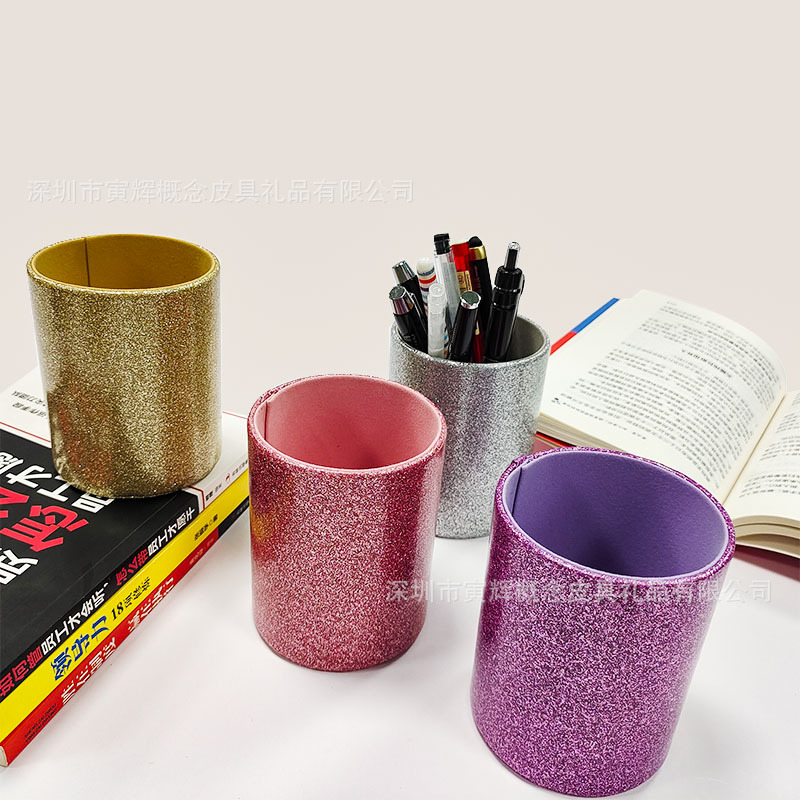 現物はアマゾンの多色グリッターフラッシュpu収納ペン筒ペン桶皮革創意化粧ブラシを供給しています。
