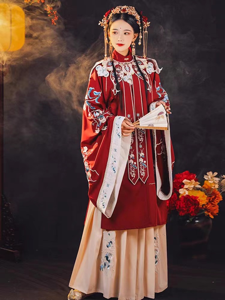 花団ショートニング新商品オリジナル漢服女性明製馬面スカート高級優雅重工刺繍雲肩立襟シャツ春金