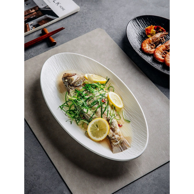 セラミックシンプルな魚皿、高級家庭用蒸し魚皿、焼き魚大魚皿、石目野菜皿、楕円形皿