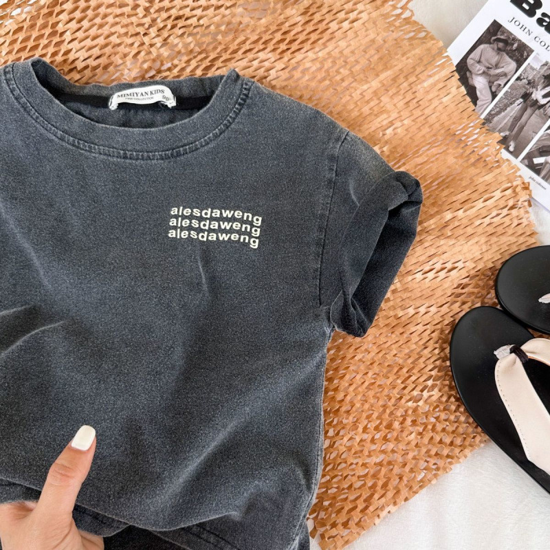 ダメージ加工ブラックコットン半袖ハンサムボーイズスタイルレタープリント子供用Tシャツ幼稚園サマートップ