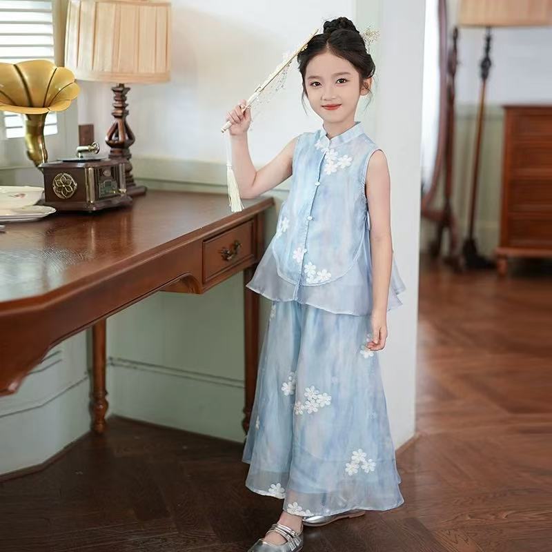 女の子スーツ 2025 夏の新刺繍ノースリーブトップワイドレッグパンツ新中国風漢服ツーピースセット