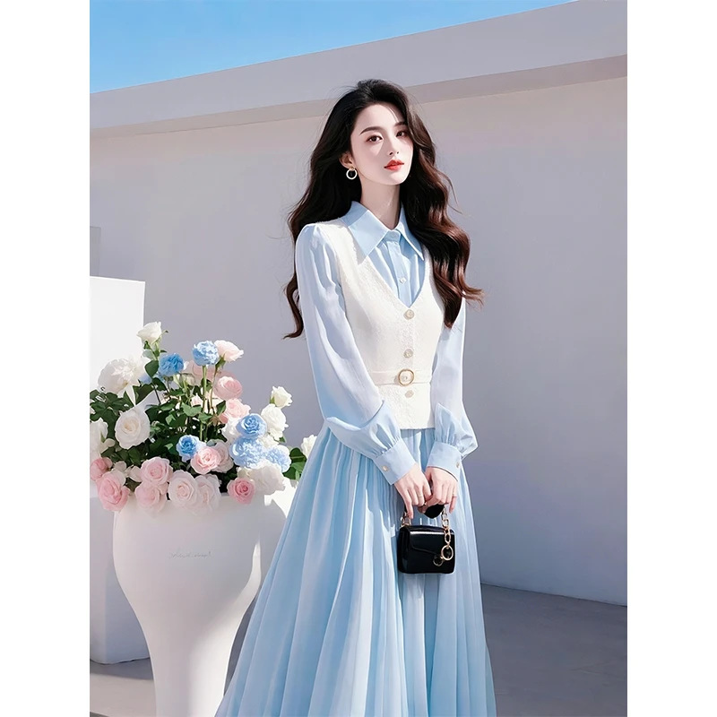 2025年初春の着こなしに、美しい韓国風のライトブルーのドレスとベストのセットをドロップシッピングします。