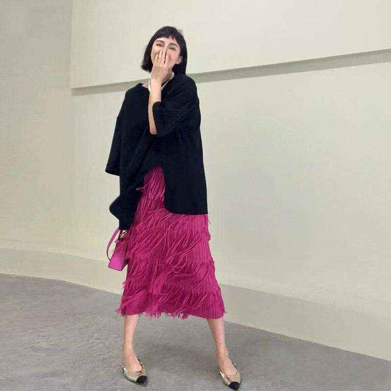 プリーツタッセルスプライシングスカートサマーニッチ気質スリムケーキスカートスリット半袖Tシャツ2枚