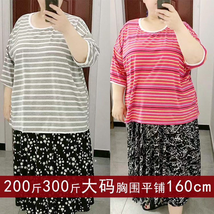 大きいサイズの婦人服の7分の半袖のtシャツの女性の200斤の300斤の太っている妹の丸首のストライプのゆったりしている半袖のtシャツの上で
