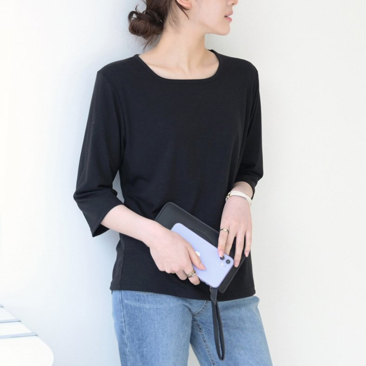 春と秋の七分袖のtシャツの女性の新型の丸首の純色の中袖の上着の底のシャツの上着の大きいサイズのu襟のファッションのtシャツ