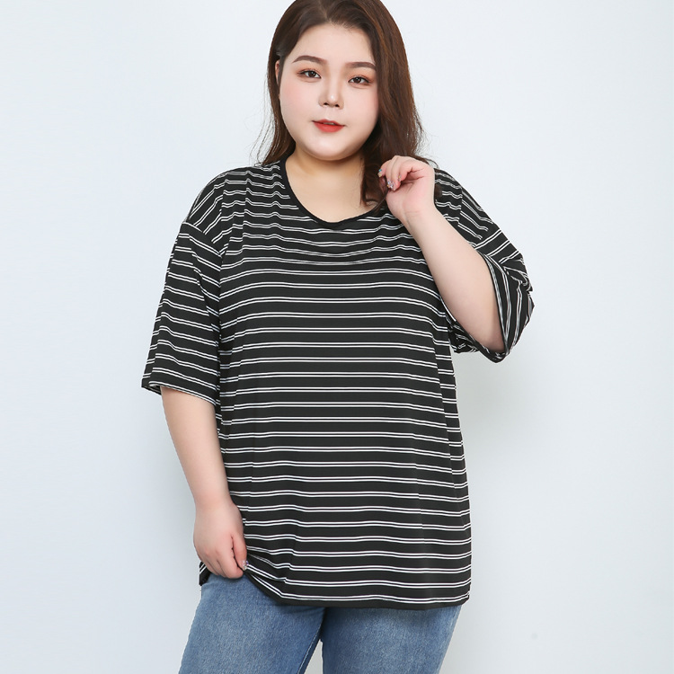 200斤の大きいサイズの婦人服の太ったmストライプの弾力性の半袖の上着のゆったりした女性の半袖のtシャツの300斤の上着