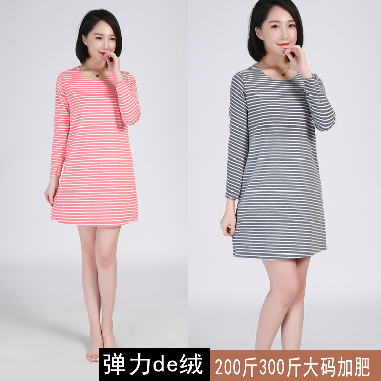 太ったm 200斤は太った大きいサイズを加えて保温して底のtシャツのスカートの両面のde絨毛のストライプの長袖の秋のズボンのワンピースを打ちます。