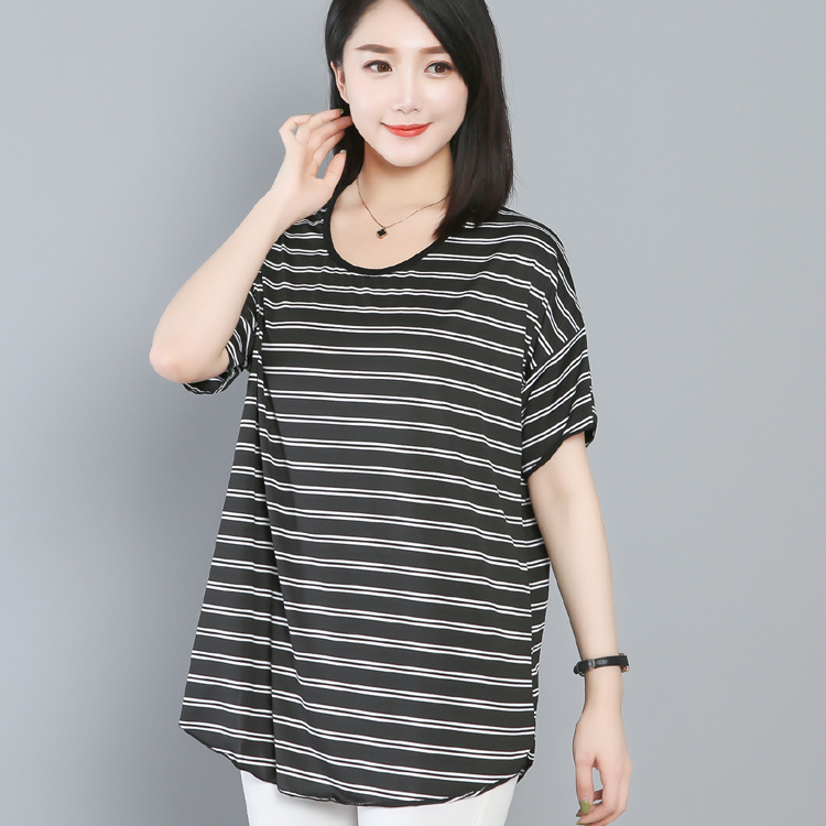 200斤300斤400斤大サイズの女性加肥縞半袖コウモリシャツtシャツ上着卸売り代発