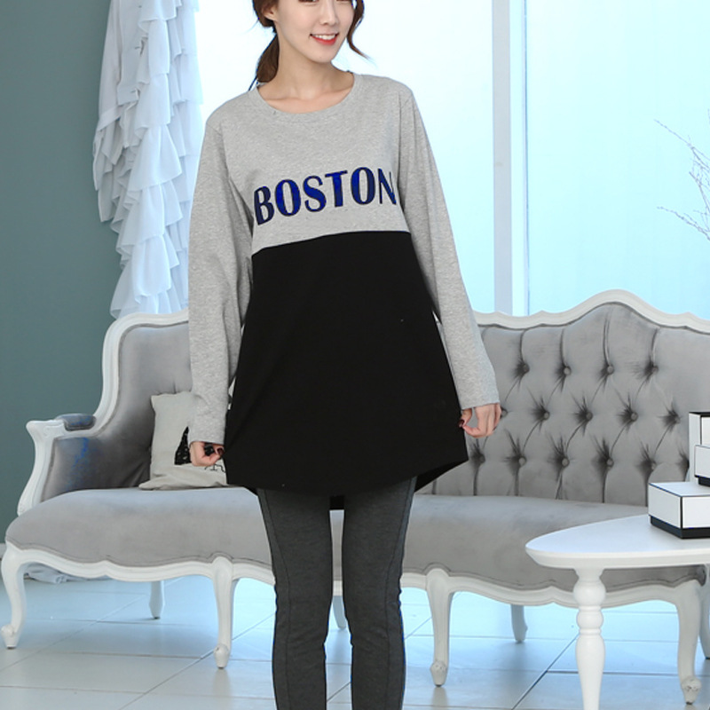 韓国版女性秋の新しい長袖の中の長さの大きいtシャツのスカートのカジュアルなつなぎ合わせのアルファベットの綿の200斤の太ったmm