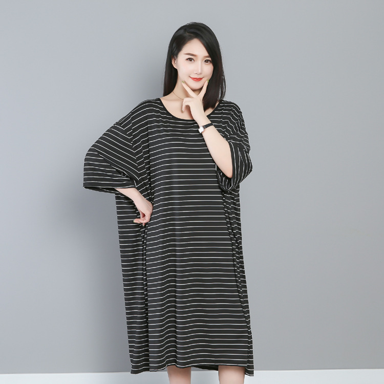 大きいサイズのワンピース200斤300斤の太ったm夏の縞のゆったりした中の長いベストスカートのパジャマ