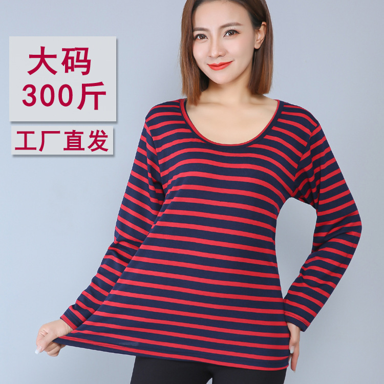 大きいサイズの婦人服の200斤の300斤の女性の弾力性の丸首のストライプの長袖のtシャツの底のシャツの工場は直接に代行します。