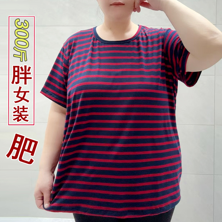 300斤の大きいサイズの婦人服の200斤のニットのストライプのゆったりしている大きい体のtシャツの太った丸首の半袖のtシャツの上着は腹を覆います。