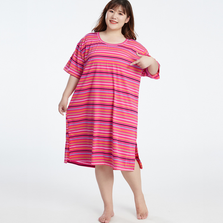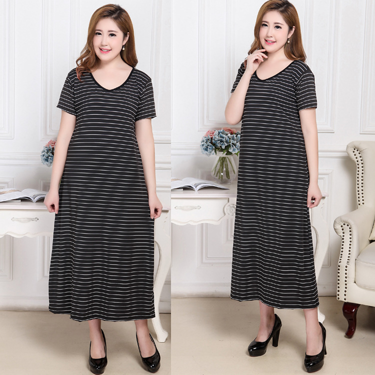 300斤の太ったmmの大きいサイズの婦人服の弾力性のメリヤスのストライプの半袖の長いtシャツのスカートの睡眠のスカートは肥えた家の服をプラスしてフォークを開けます。