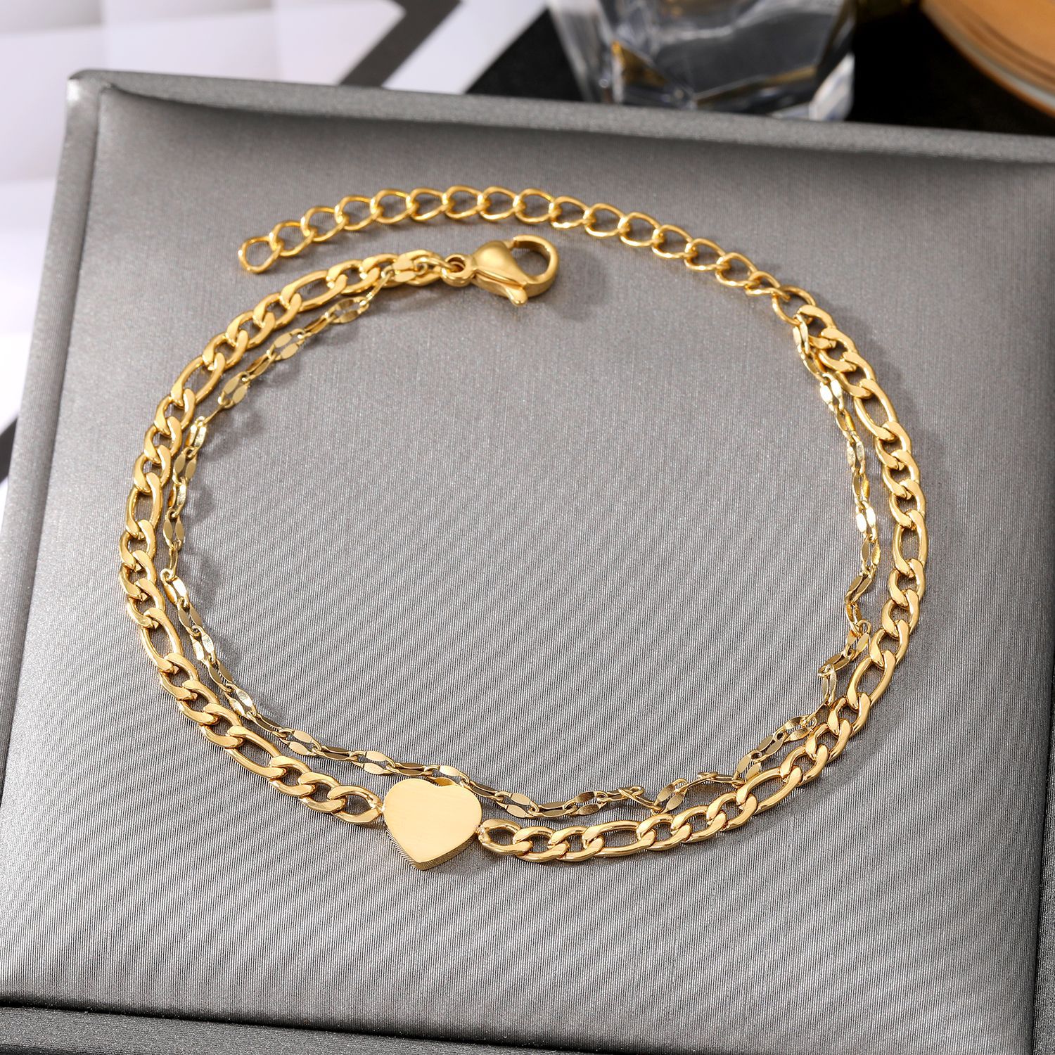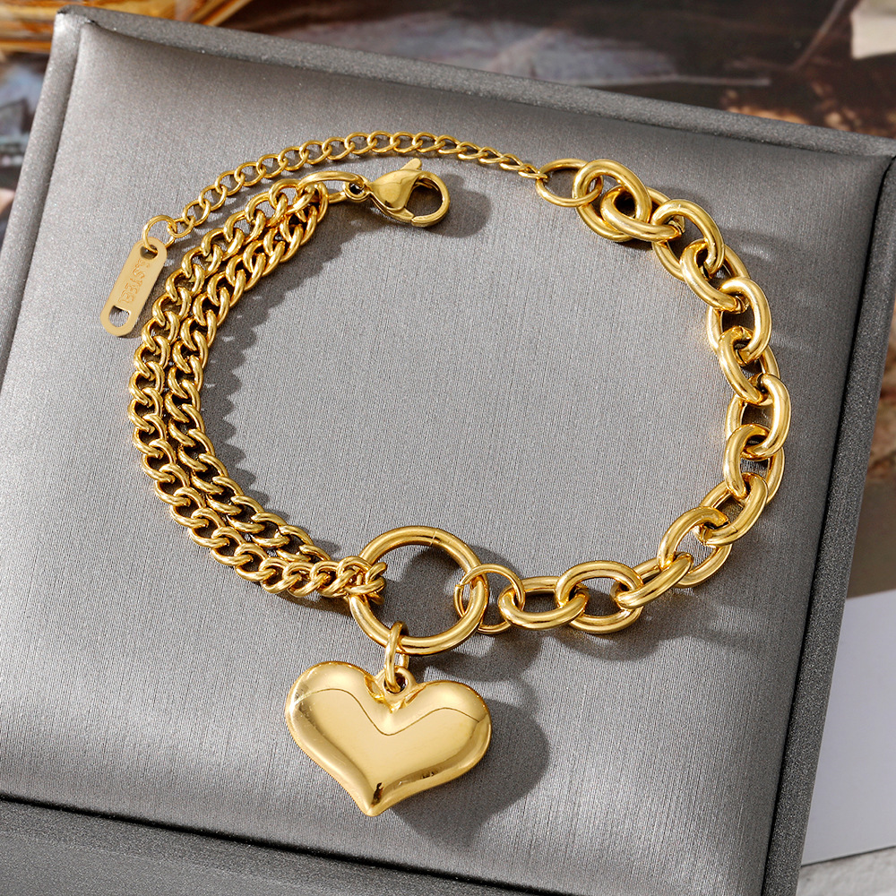 欧米のレトロなステンレスの桃の心の二重のブレスレットの女性insヒップホップは色を落とさないで二重のチェーンの金色の愛のブレスレットをつづり合わせます。