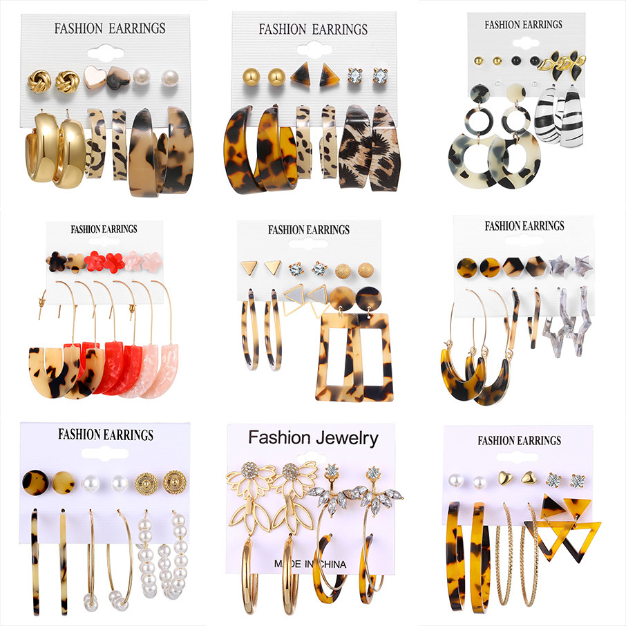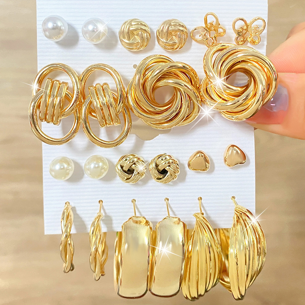 項投卡装イヤリング11/12対セット幾何学金色金属真珠樹脂耳輪6対アクセサリー女