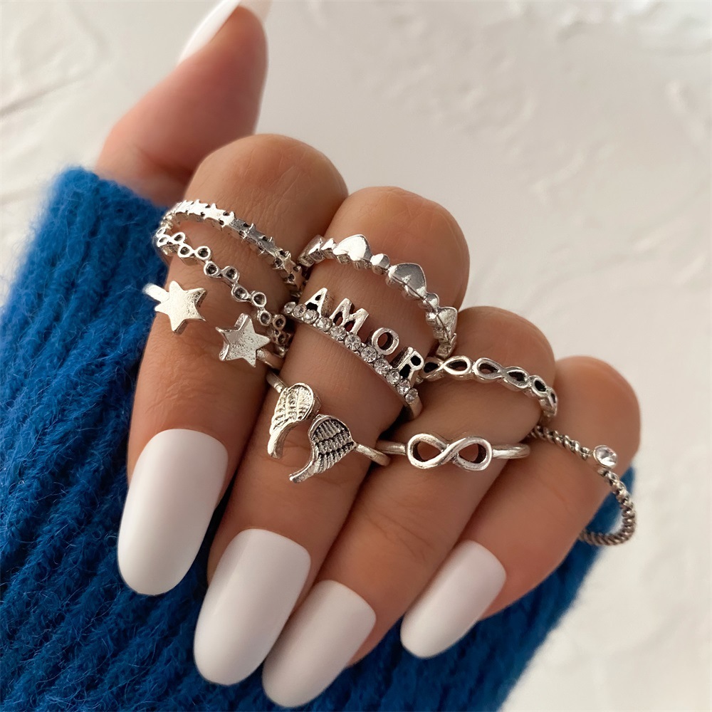 レトロな愛の透かし彫りの指輪の9セットの翼の8字の無限の記号のAMORのアルファベットは愛の五芒星の指輪をドリルします。