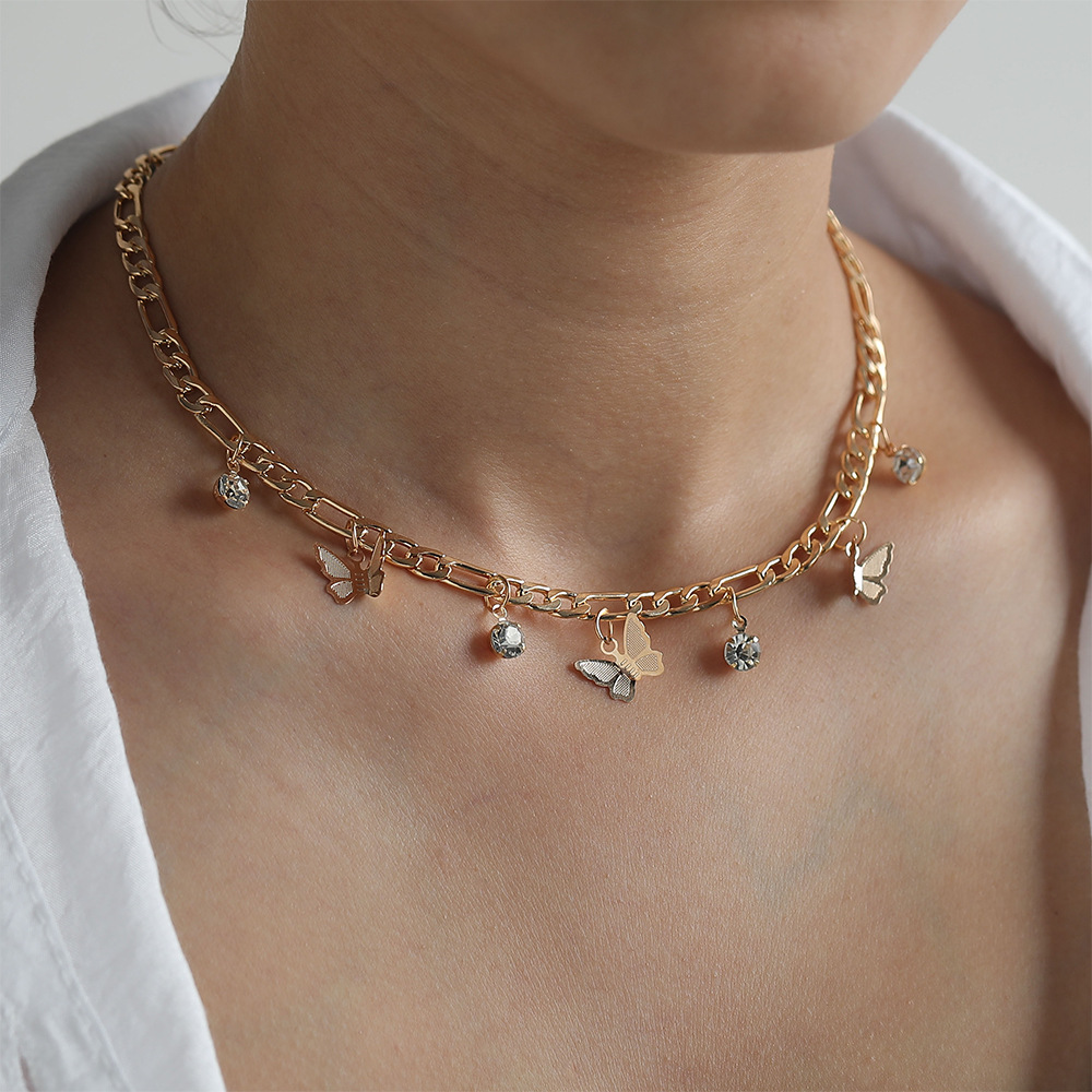クロスボーダーの軽い豪華な大衆の設計のネックレスのヒップホップの復古の個性の新型の蝶のドリルの合金のネックレスの金色の欧米
