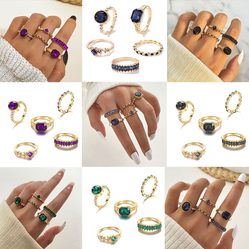 エコ保色リング5点セット欧米貴婦人レトロ宮廷緑黒青紫宝石楕円指輪