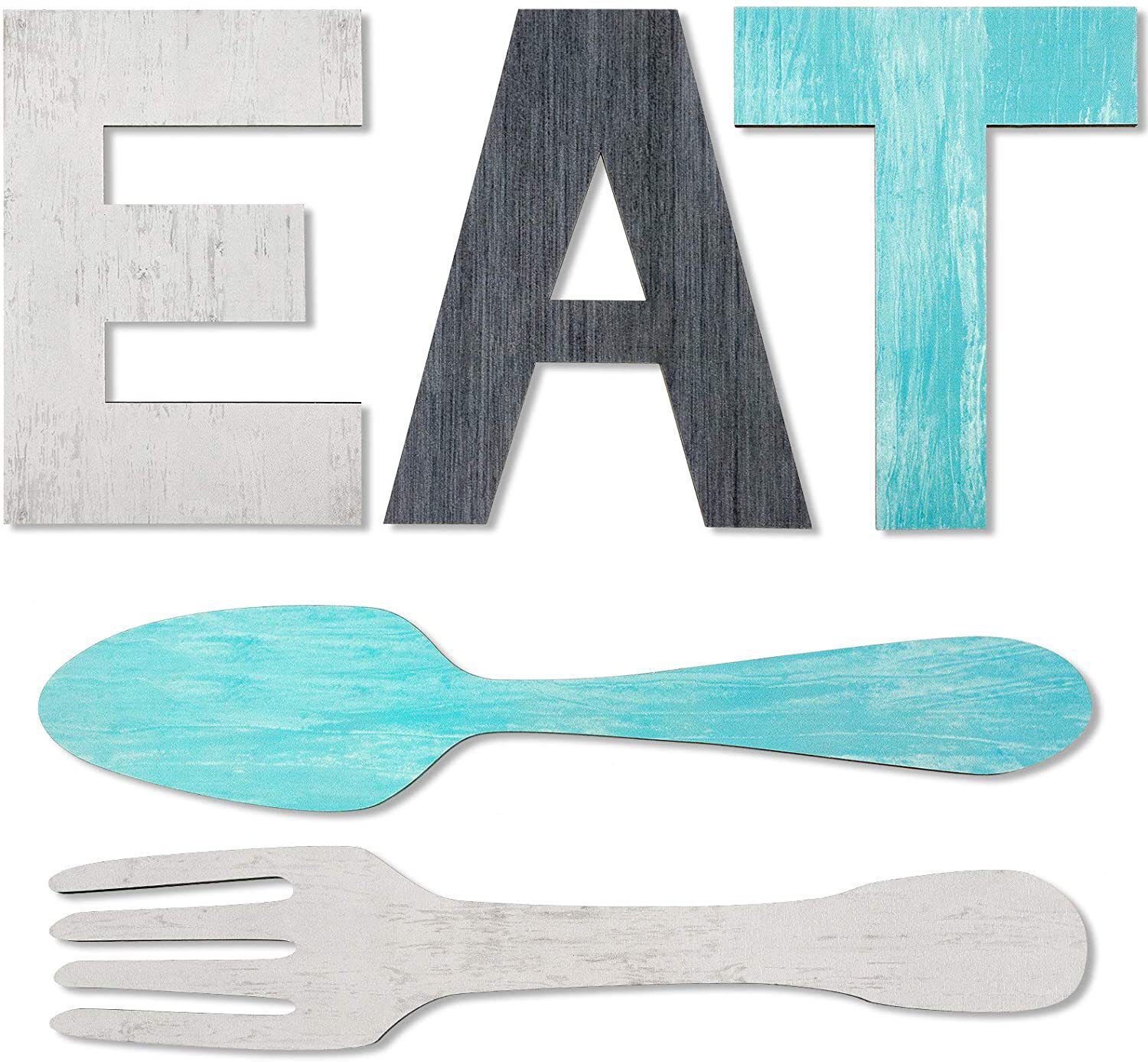 Eatロゴ、フォークとスプーン壁面キッチン家庭装飾吊り木製文字、田舎の壁芸術