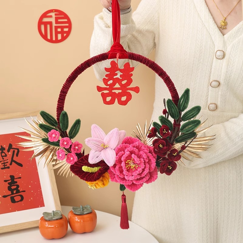 春節の祝福の文字が書かれたツイストスティックペンダント、超高密度の毛糸、幼稚園向けの特別な手作り子供用材料、DIYブーケ包装