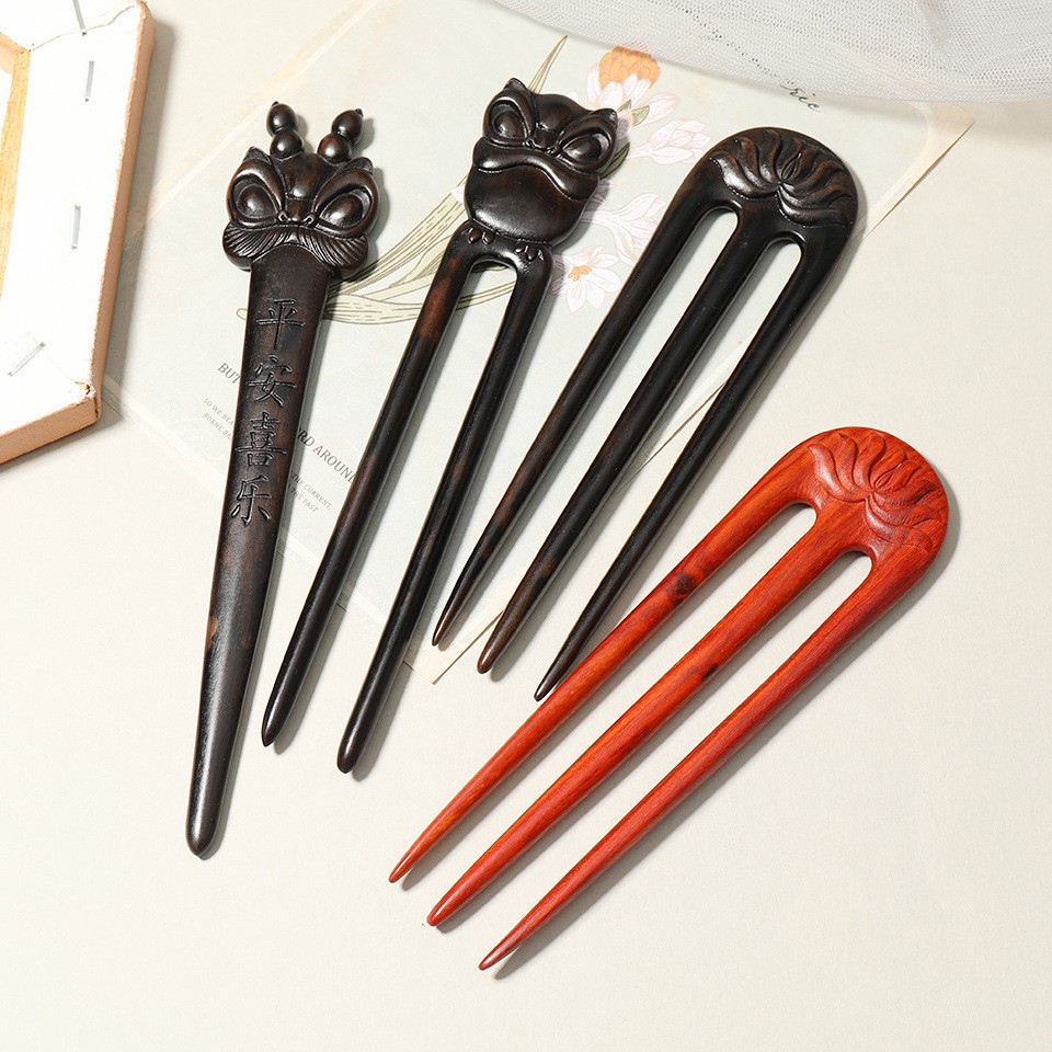 復古新中国式黒檀木彫刻手作りヘアピン古風現代シンプル高級感ダブルヘアピン髪飾り