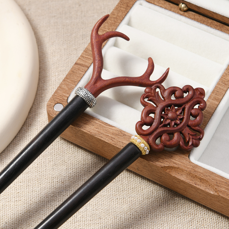 レトロでシンプルな彫刻鹿の角の黒檀木のヘアピン