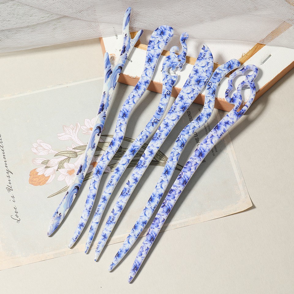 レトロな民族のかんざしの新しい中国式の古典の青と花の磁器の高級感のチャイナドレスの漢服は髪を挽きます。