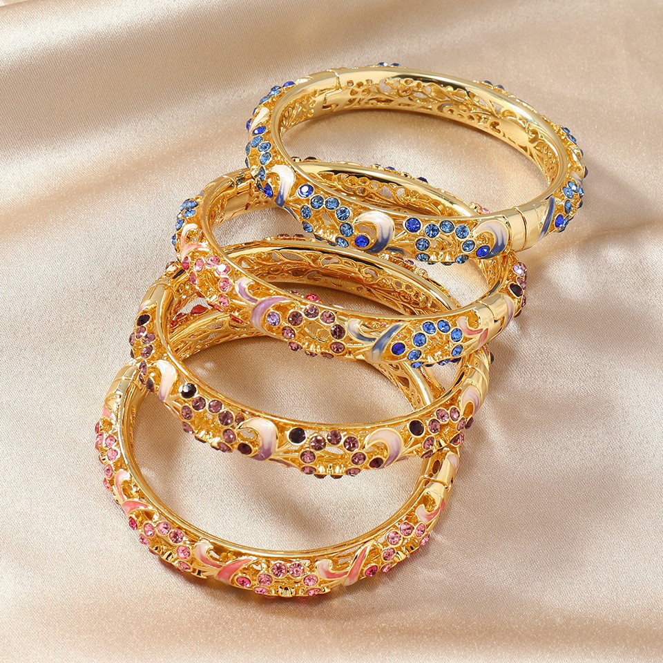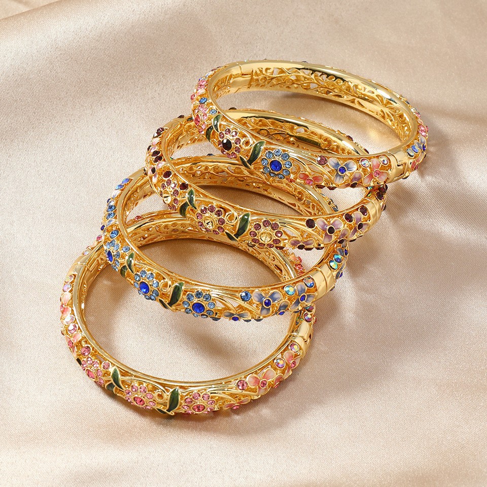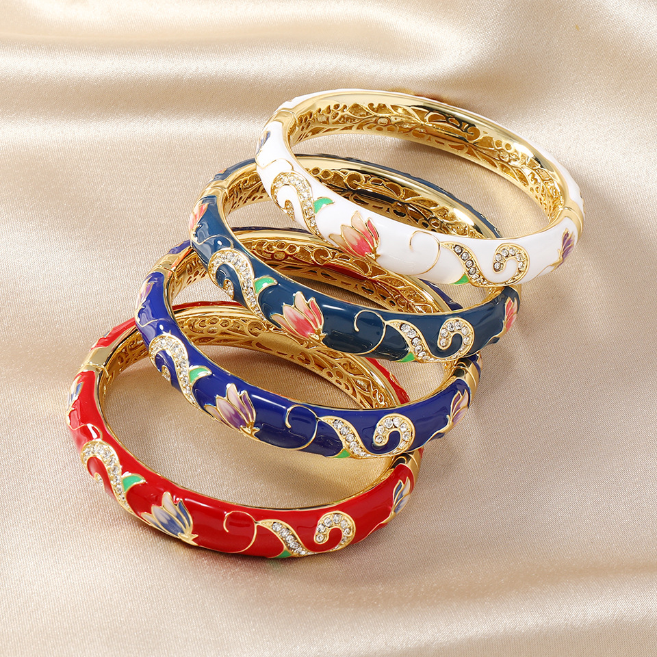 新商品の景泰藍のエナメルの色彩は糸を絞めて透かしを彫って金メッキの幅の丸い女性の腕輪のファッションの復古の民族の風のアクセサリーの贈り物を切ります。