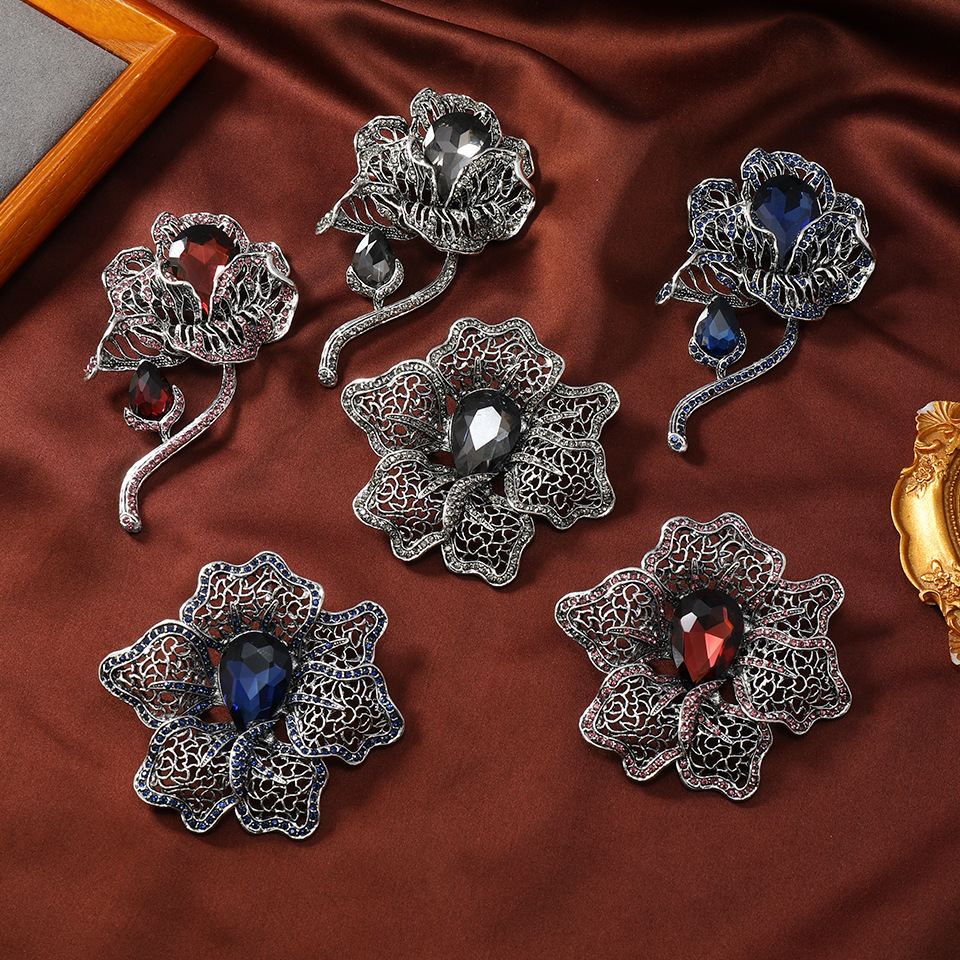 レトロ宮廷風瑠璃花透かし彫り古銀大版胸花ピン気質ファッション洋服コートアクセサリーブローチ