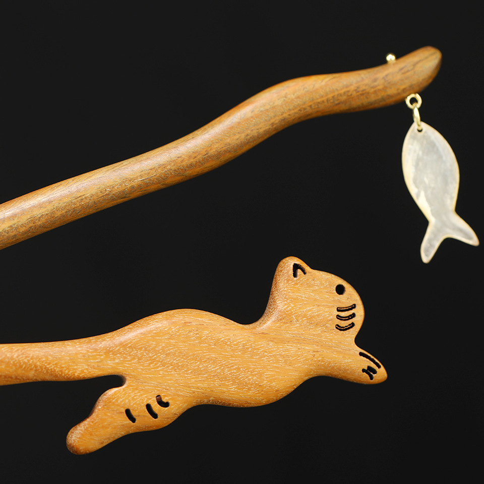 猫の釣りの新型手作りの緑檀のかんざしのレトロで可愛い猫のかんざしの古風な漢服のチャイナドレスの髪飾り