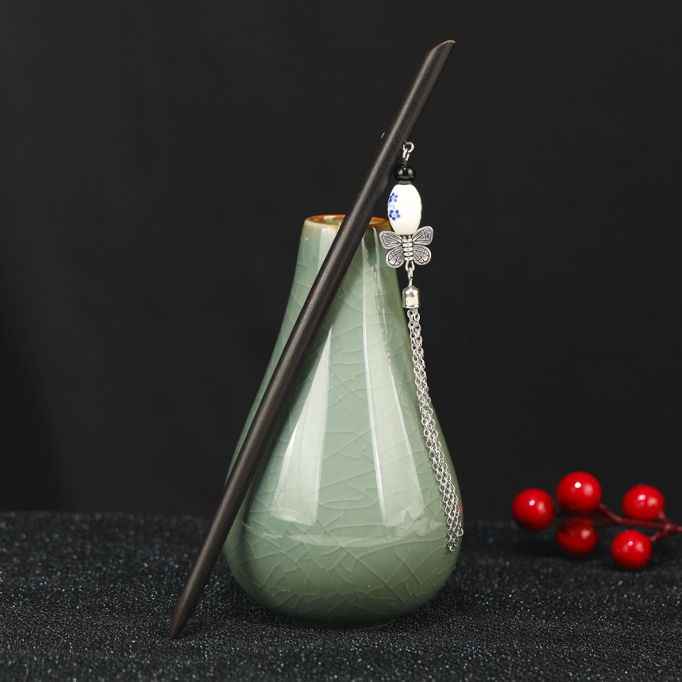 黒檀の木のかんざしの青と花の磁器のフリンジの足並みはかんざしの古風な頭飾りを揺らします。