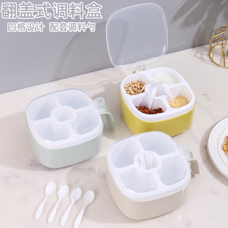フリップ式分格調味料ケース四格一体塩味の素調味料ケースキッチン大容量スプーン付き調味料ケースセット