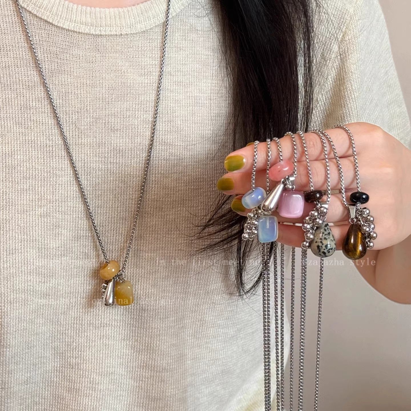 チタン鋼タイガーアイストーンロングネックレスレディースサマーニッチハイエンドセーターチェーン天然石ブドウストリングペンダントメンズ