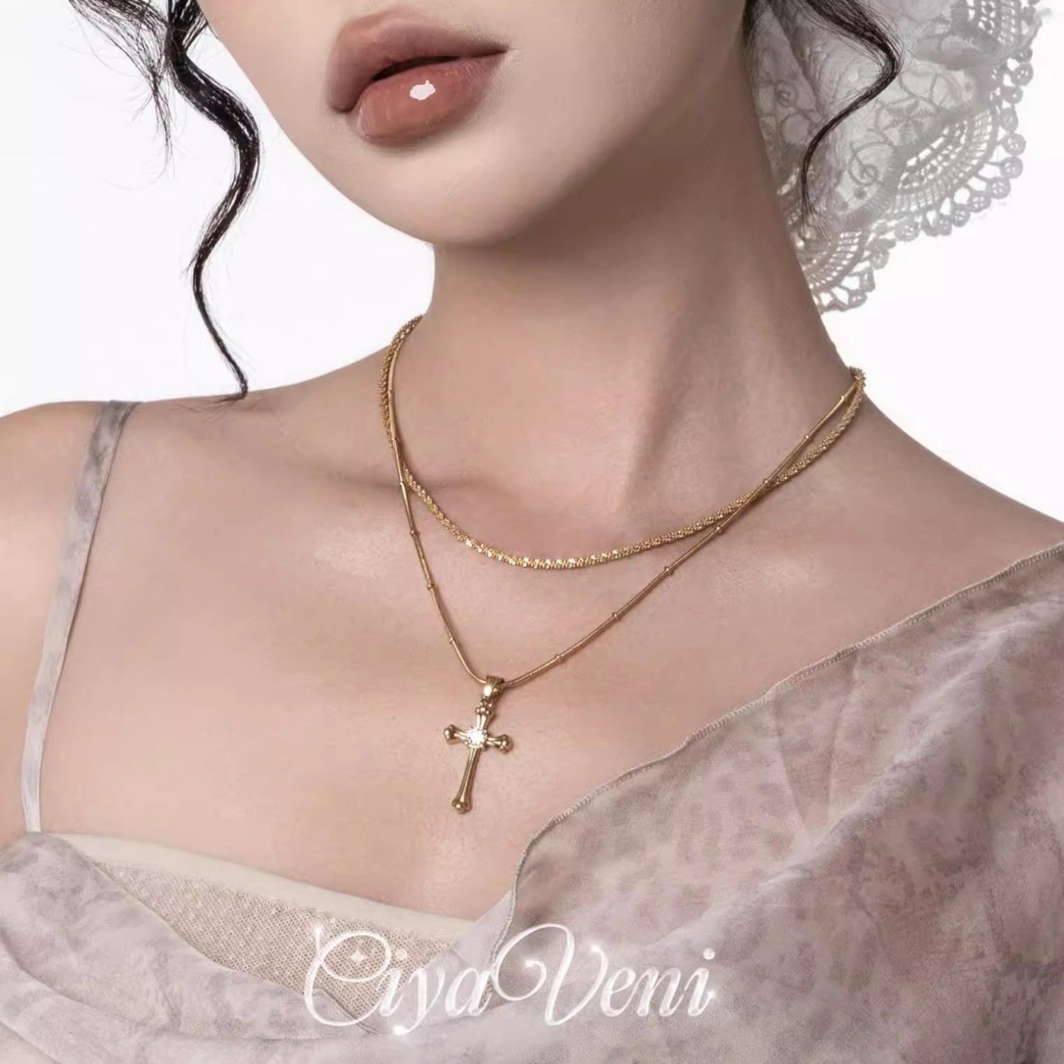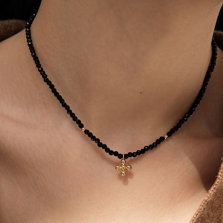 2025 新しいブラックゴールドチップファインフラッシュゴールドビーズ小さなクロスレトロチョーカーネックレス