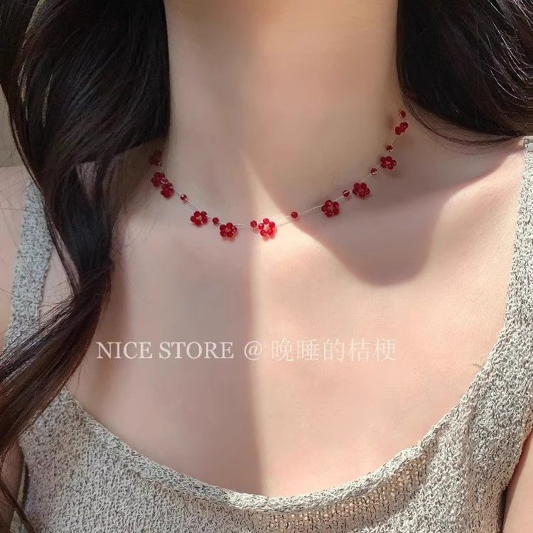 夜更かしのキキョウ「マウンテンベリー」夏らしい爽やかな赤い多面ビーズネックレス美白鎖骨チェーン