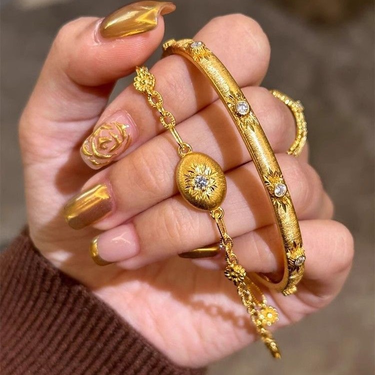 レトロな金色のシルクの花のブレスレットのフラッシュドリルは、洗練された手飾り2025の新しい布契風を重ねています
