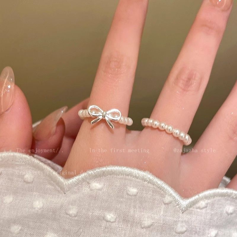 ライトラグジュアリー〜ニッチリボンイミテーションパールリングビーズコールドスタイルインノーブル人差し指リングハイエンドリング