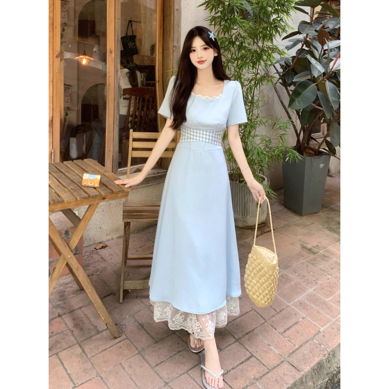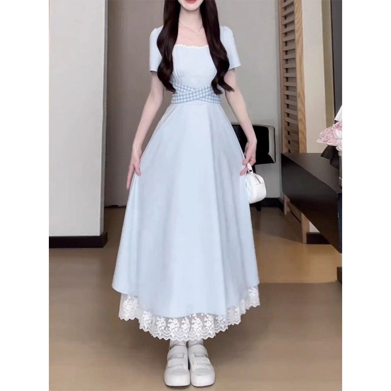 ブルーの背の高い女性用フレンチドレス 2025 今年の流行の初夏の新しいスタイルの半袖ロングスカート