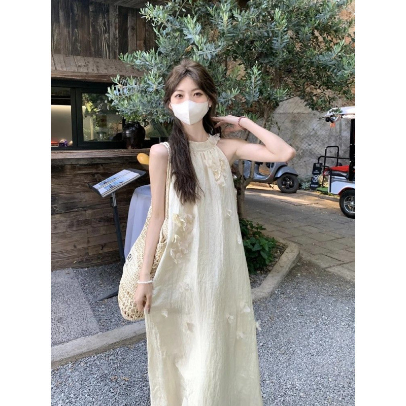 立体的な花アプリコットホルターネックサスペンダードレス女性の夏の海辺の休暇スタイルフレンチスタイルスーパーフェアリーノースリーブロングドレス