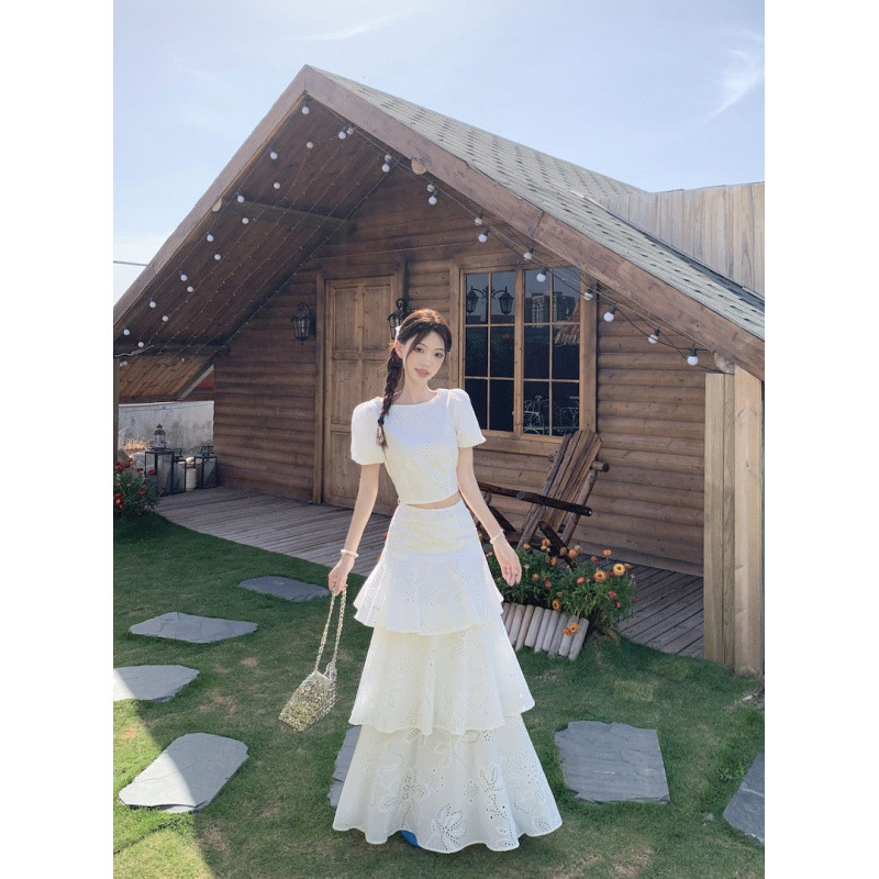 リゾートスタイルのレトロファッションスーツ女性のための中空ベストデザイン 2025 夏の新しいニッチシックなスカート