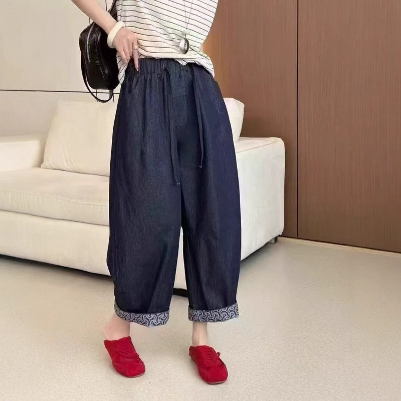 アメリカのレトロなファッションのズボンの女性2025夏の新型の薄いタイプの柔らかいデニムは腰のデニムの9分の気球のズボンを緩めます。