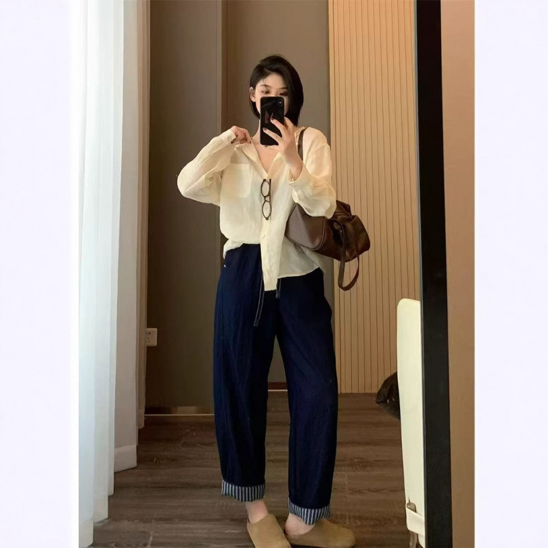 デニムの9分のズボンのレースのズボンの女性の2025夏の薄いタイプの日焼け止めのカジュアルなズボンはゆったりしていて痩せています。