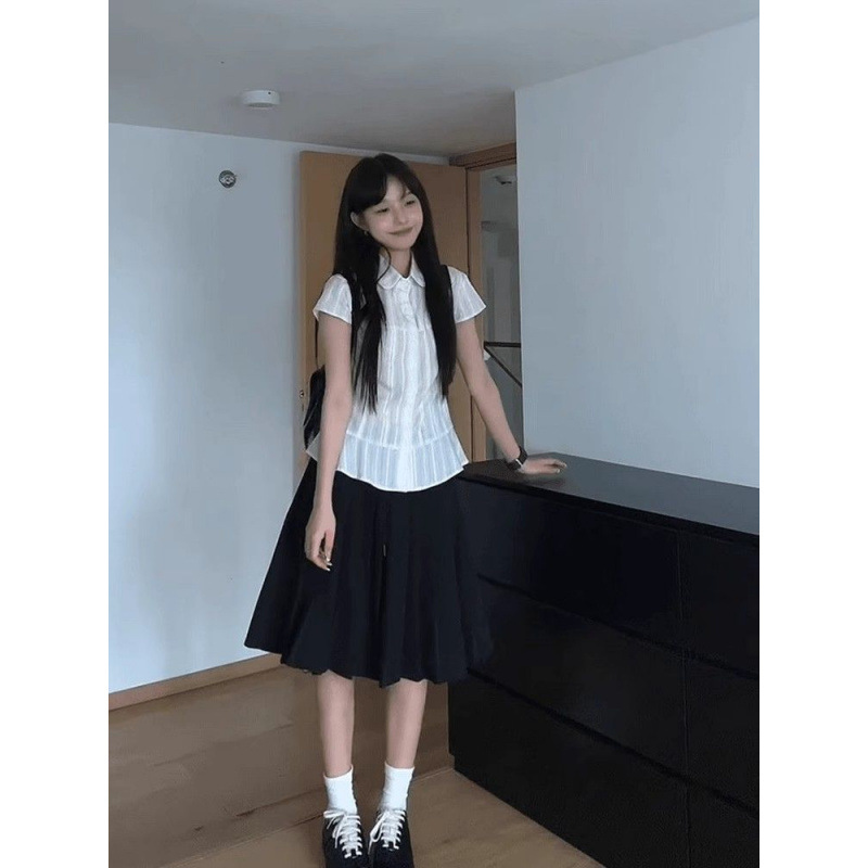 日本製白ラペルストライプ半袖シャツ女性用 2025 夏カレッジスタイル多用途スリム小飛袖トップ薄手
