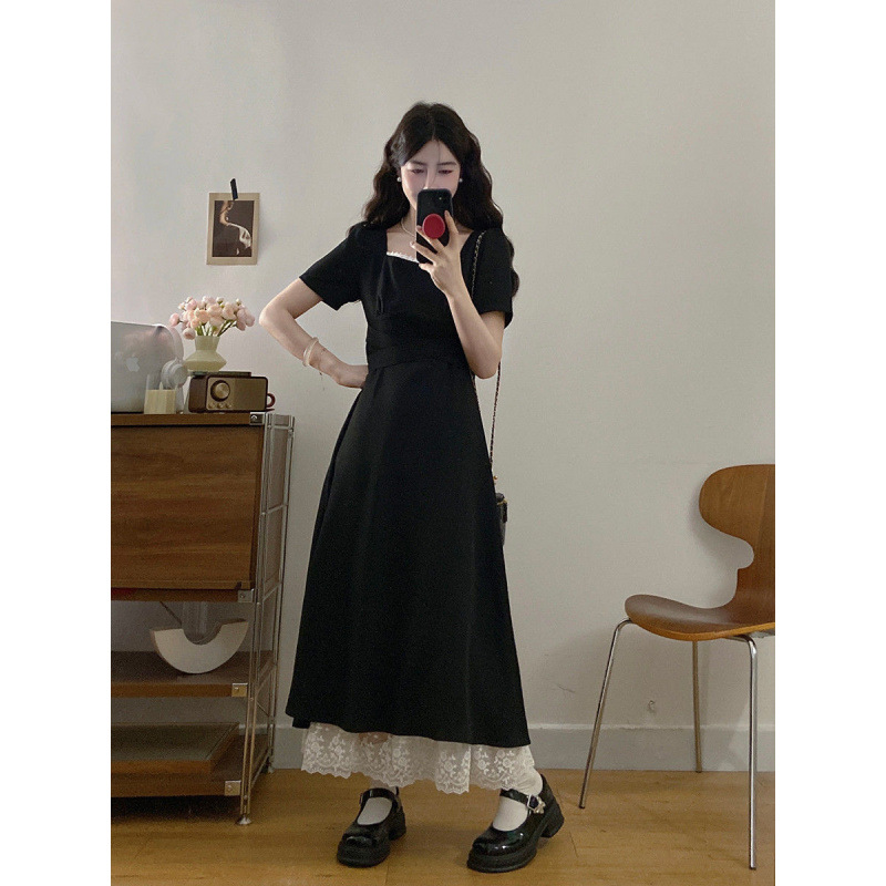プラスサイズファットmm2025夏の新ファッションレトロレーススプライシングスクエアカラードレス女性ニッチ痩身スカート