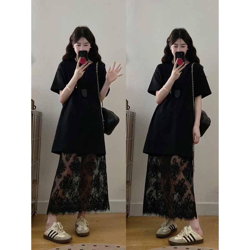 プラスサイズの女性のファットMMハイエンドラウンドネックブラックTシャツレディース2025夏新作レーススカート2点セット
