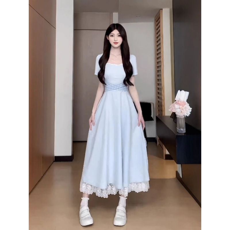 フランス式の優しい風のレースの子供の襟の半袖のワンピース2025夏の新型は腰を収めてやせている気質のスカートの女性を現します。
