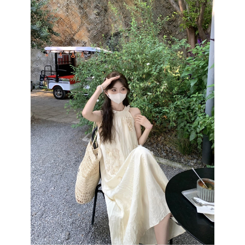韓国系フランス風雰囲気デザイン感優雅立体花首掛けワンピース2025夏新作ファッションスカート