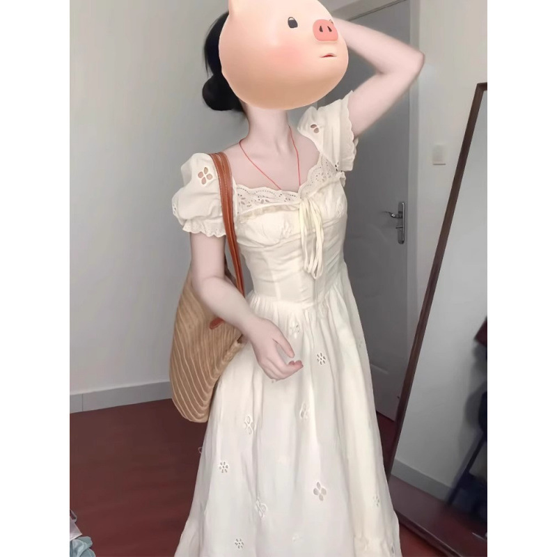 プラスサイズの優しいスタイルのスクエアネックフレンチドレス女性の夏のハイエンド気質スカートファットmmウエスト痩身ロングスカート