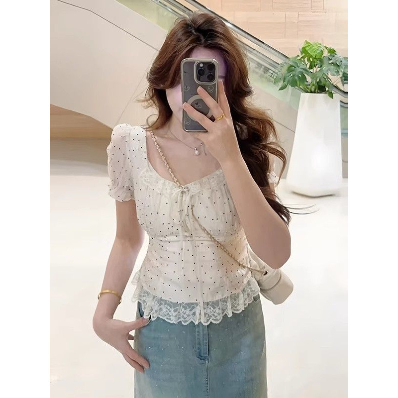 大きいサイズのフレンチホワイト水玉シャツレディース夏カジュアルハイエンドレースシャツ太ったMMカバー痩身トップ